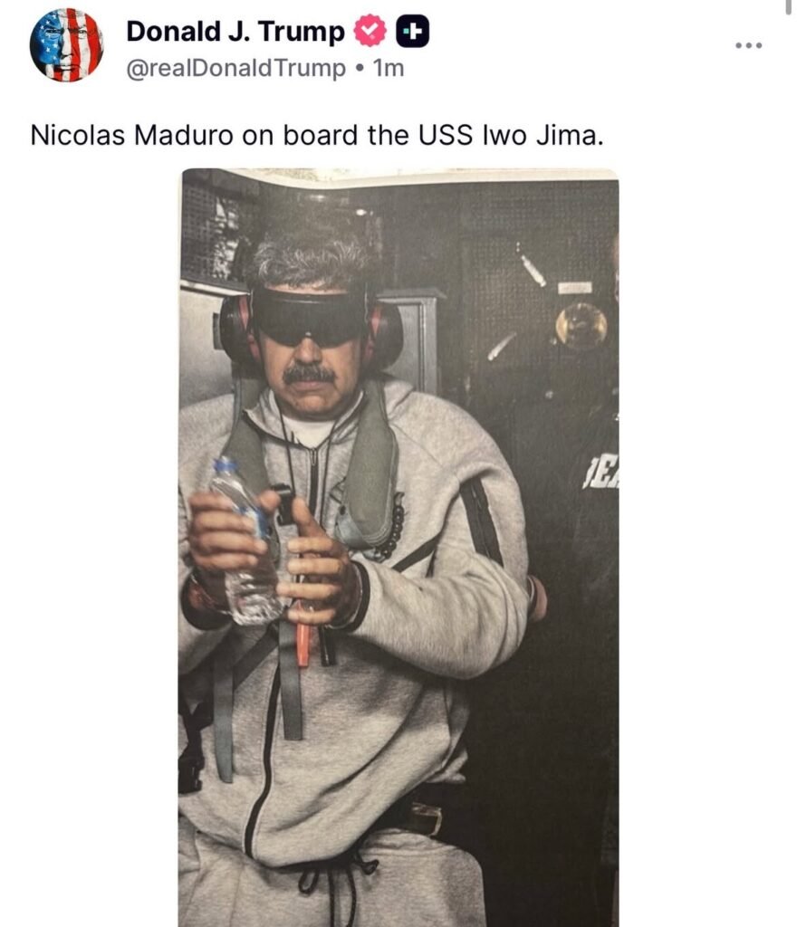 Trump publicó incluso una imagen del líder venezolano bajo custodia en su plataforma social, destacando que Maduro y Flores ya están bajo control estadounidense.