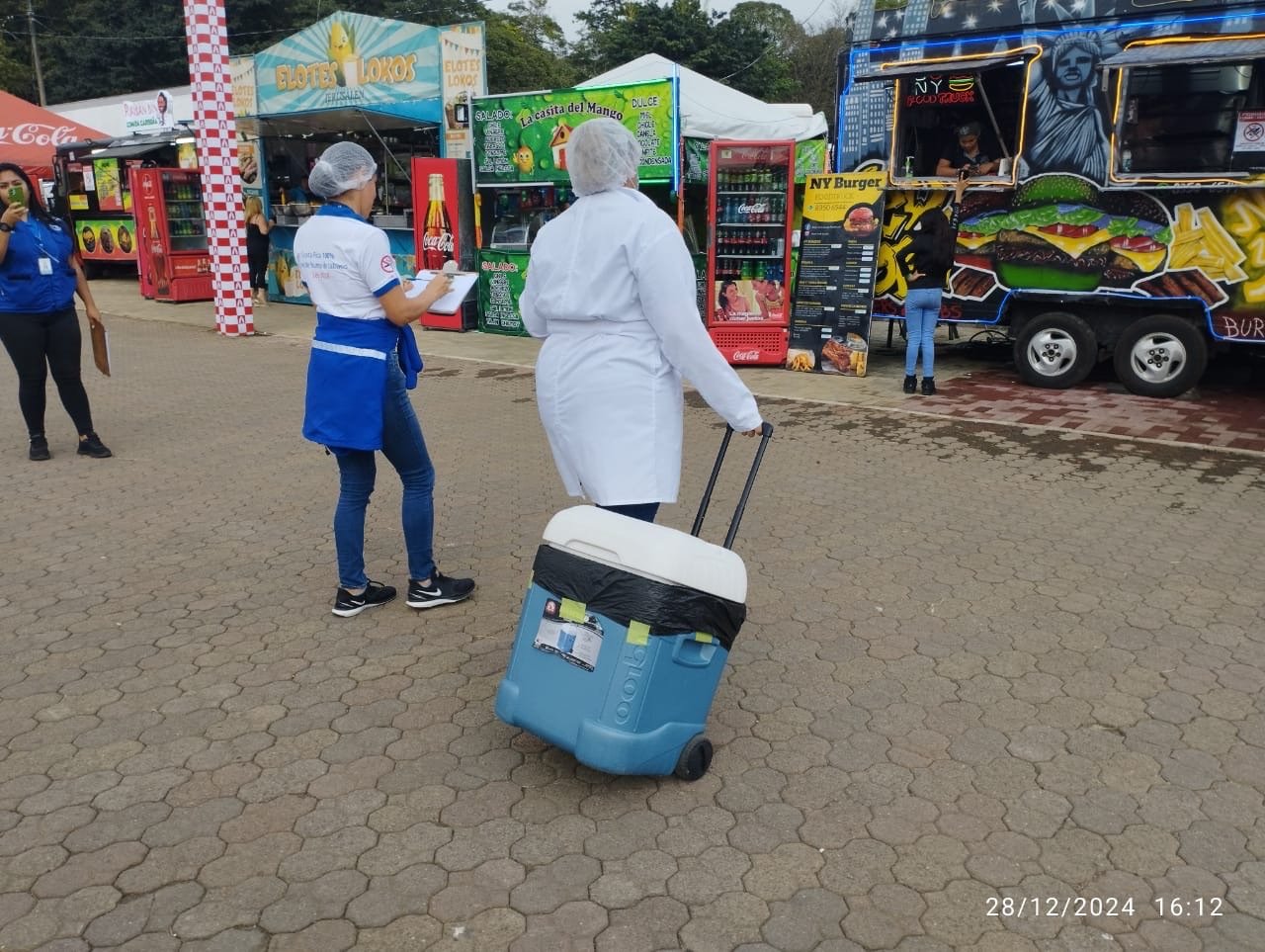 .Puestos de Alimentación: Se efectuaron muestreos microbiológicos, obteniendo resultados favorables. No obstante, se ordenó la destrucción de alimentos no aptos para el consumo y se decomisaron cuatro carnés de manipulación de alimentos falsos, lo que motivó el retiro de los portadores de dichos documentos de la manipulación de alimentos en los puestos identificados.