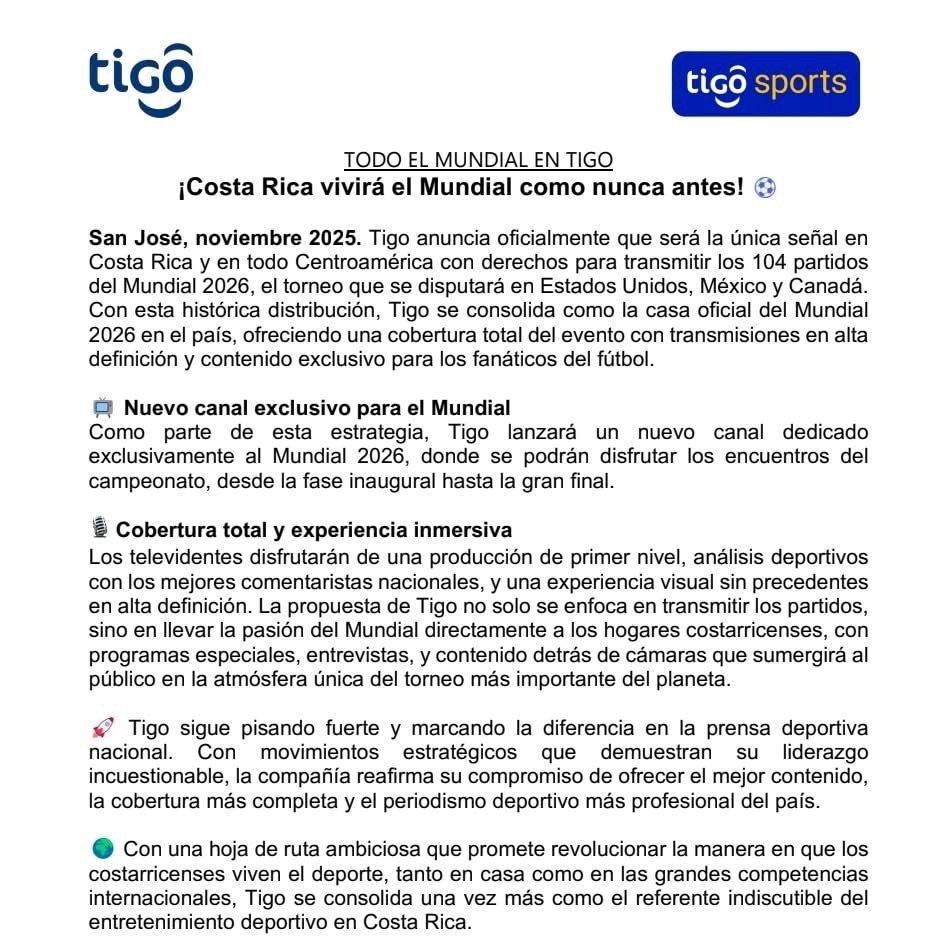San José, noviembre de 2025. La compañía Tigo anunció oficialmente que será la única señal en Costa Rica y en toda Centroamérica con derechos para transmitir los 104 partidos del Mundial 2026, que se disputará en Estados Unidos, México y Canadá.